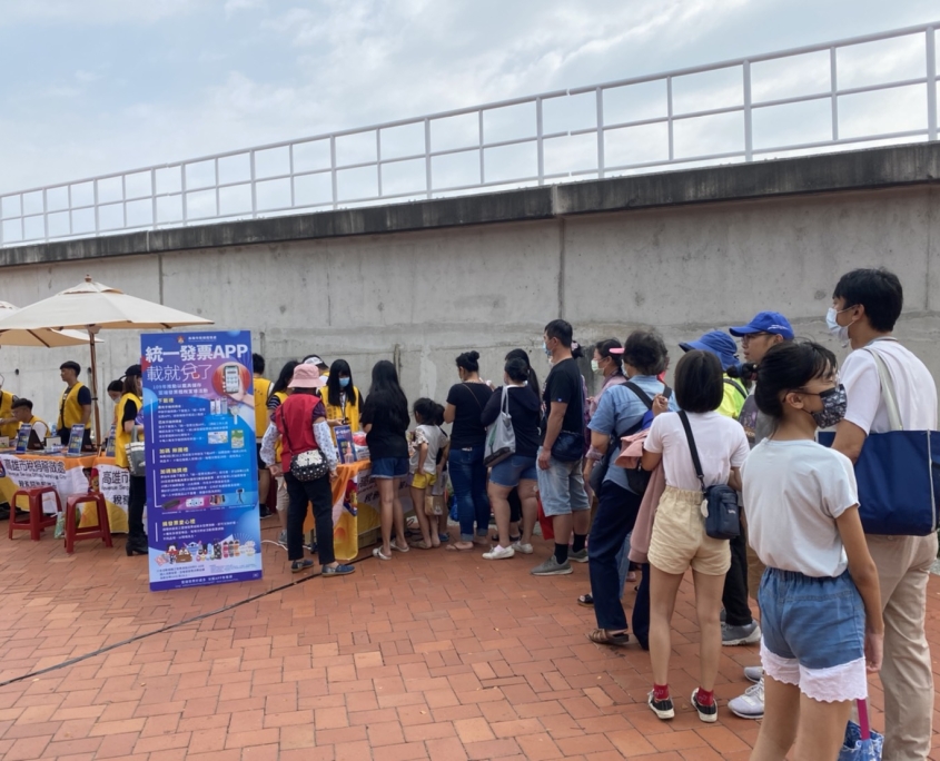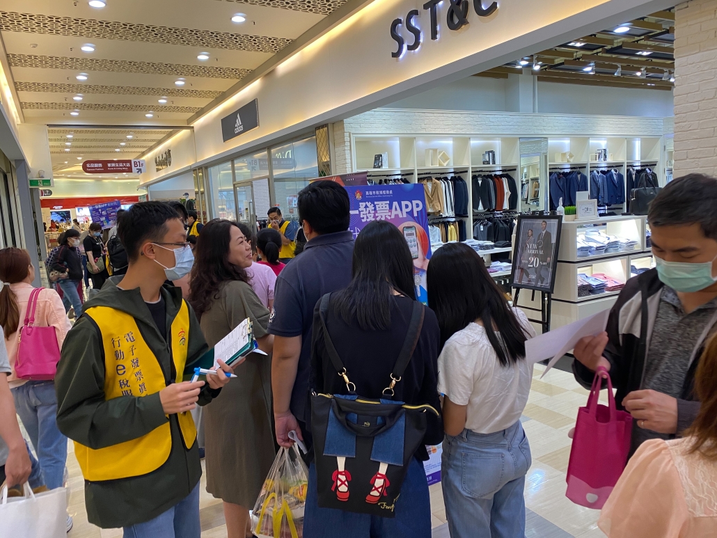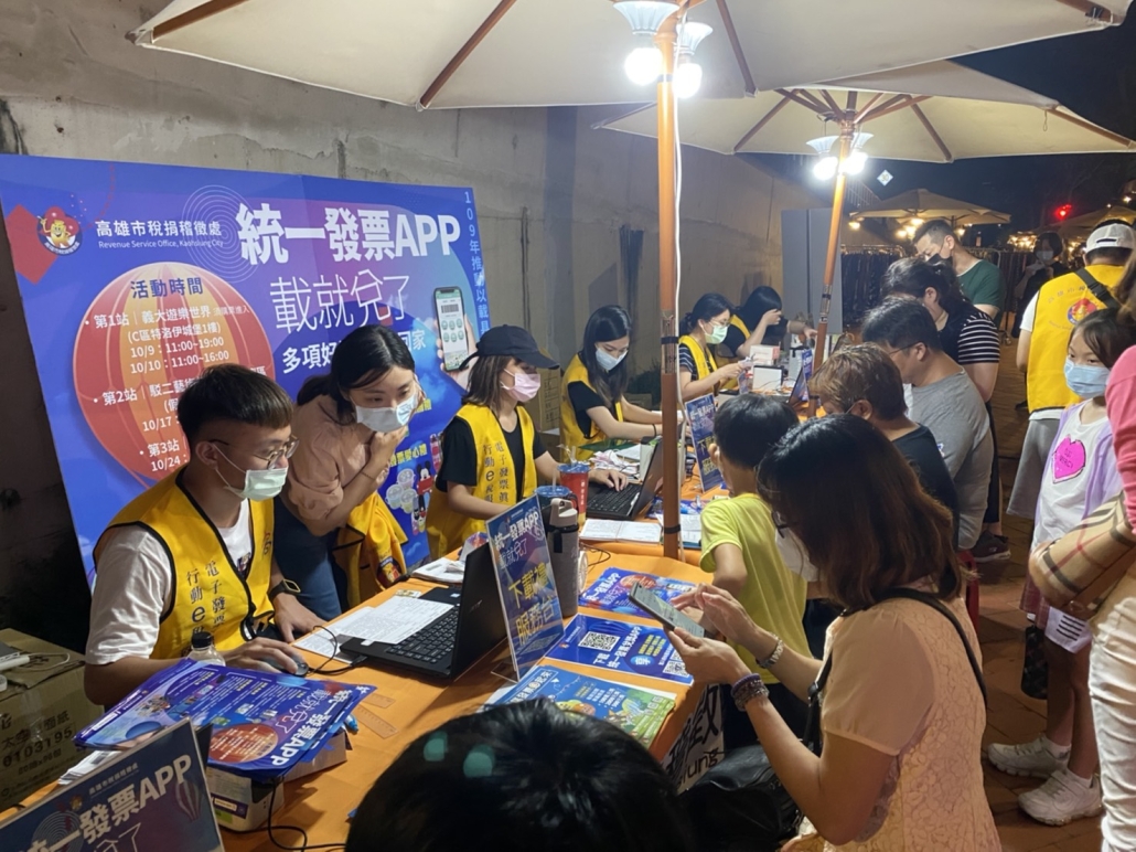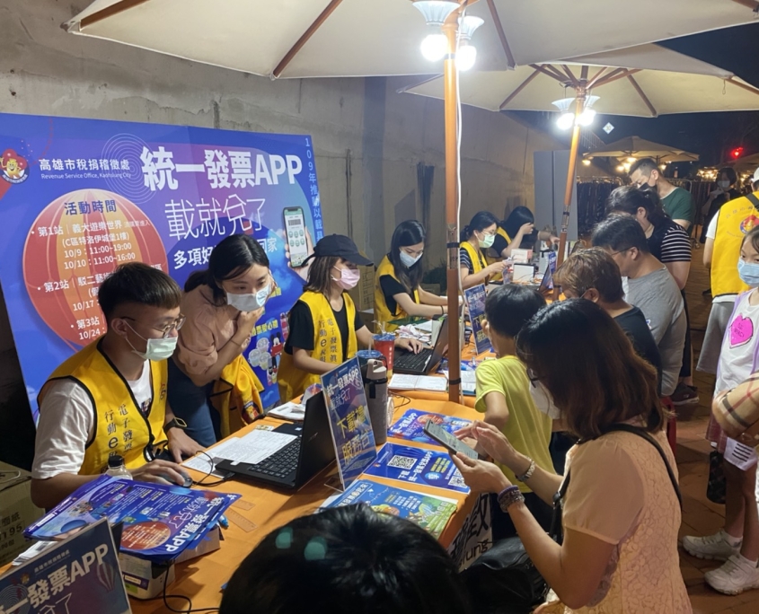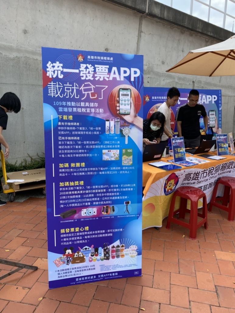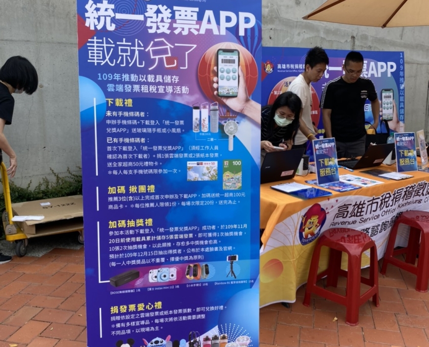 協助高雄稽徵處以載具儲存雲端發票辦理「統一發票 APP.載就兌了」宣導活動,至百貨、樂園、市集等處深入人群進行統一發票APP下載申辦,亦準備多項好禮鼓勵民眾捐贈發票做愛心。